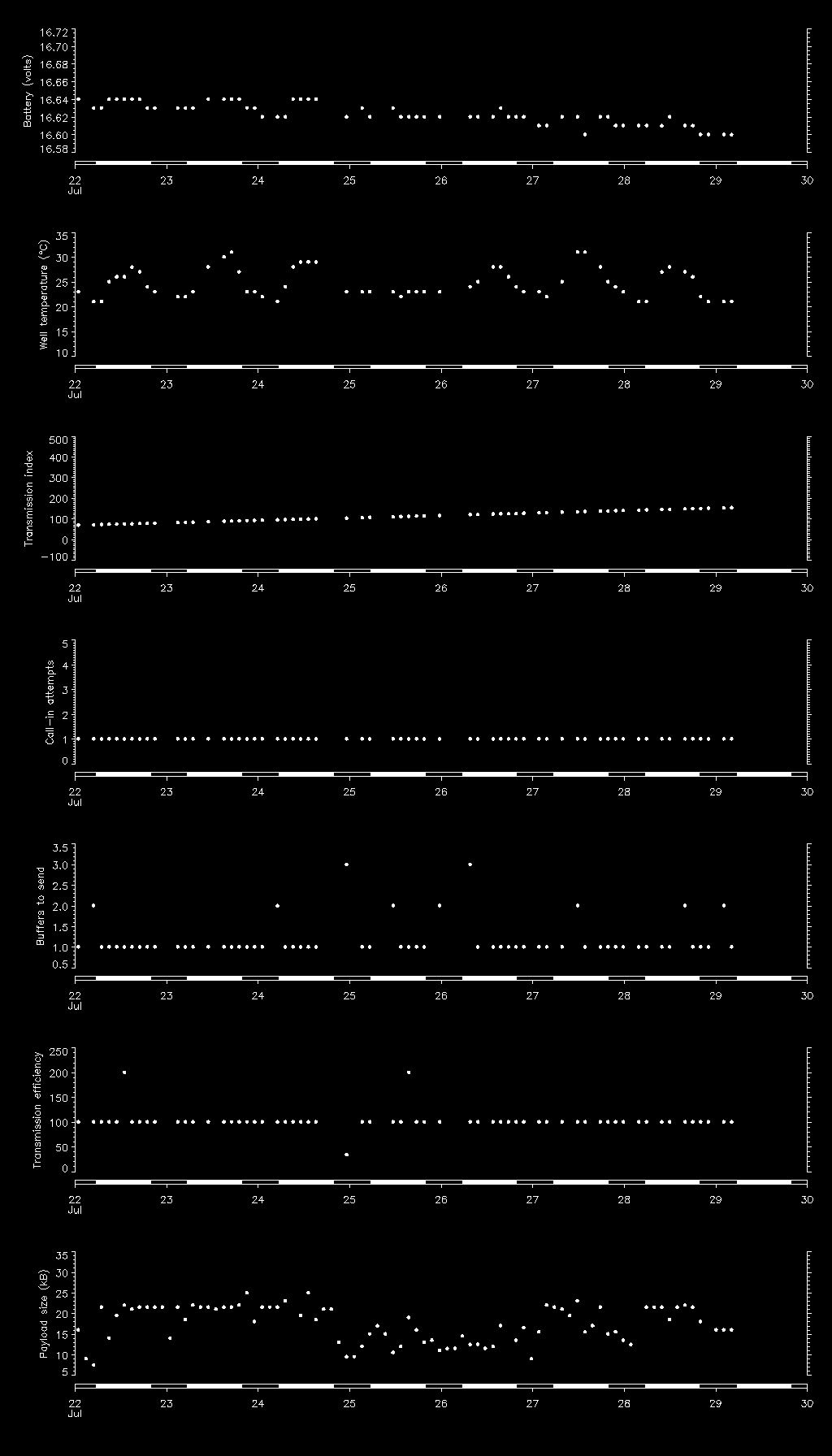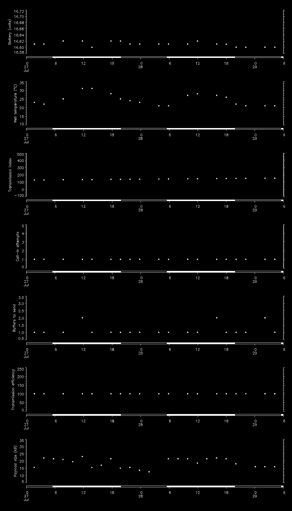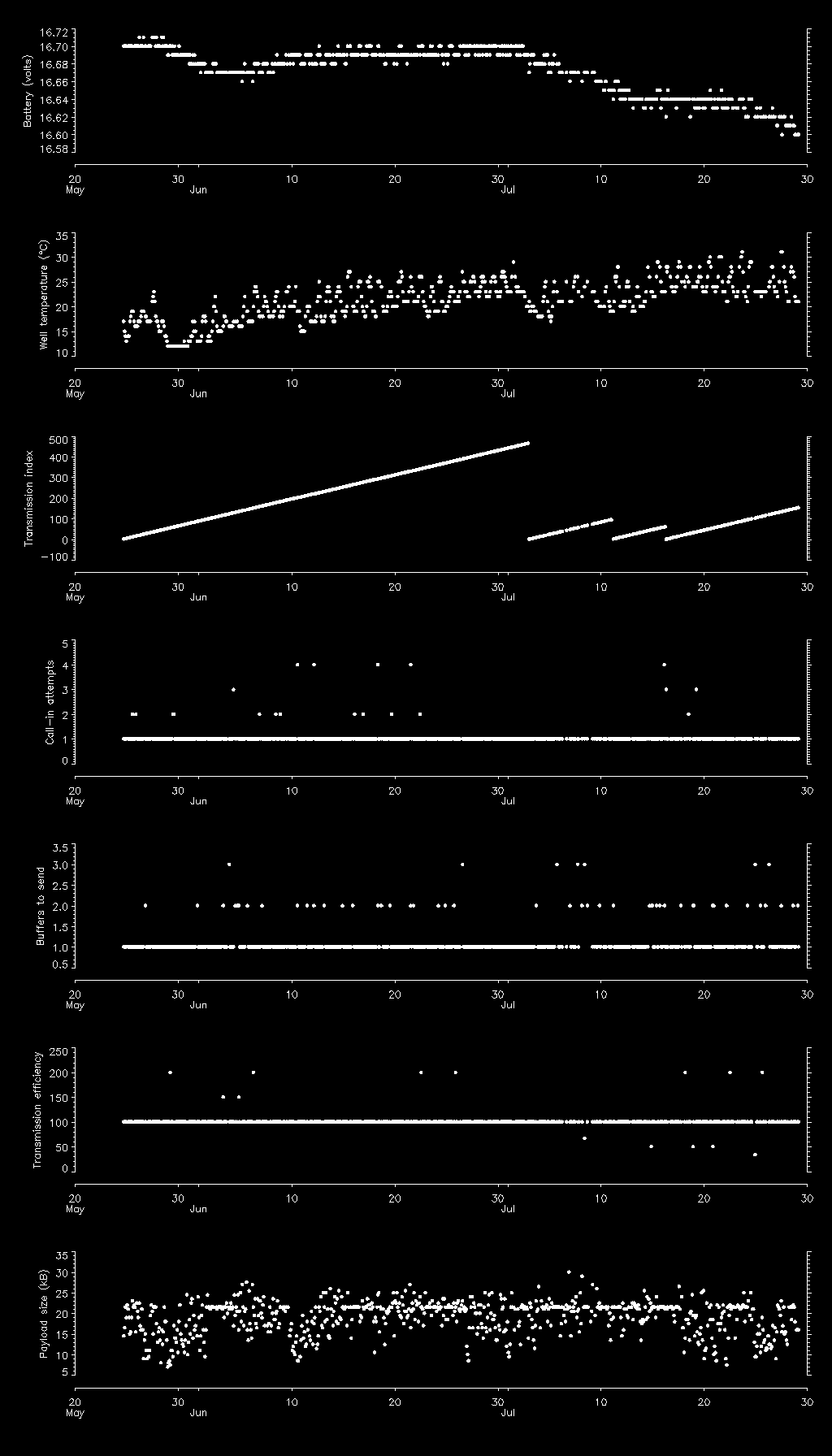 | Date/time (local) | Reason | Index | Attempts | Buffers to send | Buffers sent | Efficiency (%) | Temp (degC) | Battery (V) |